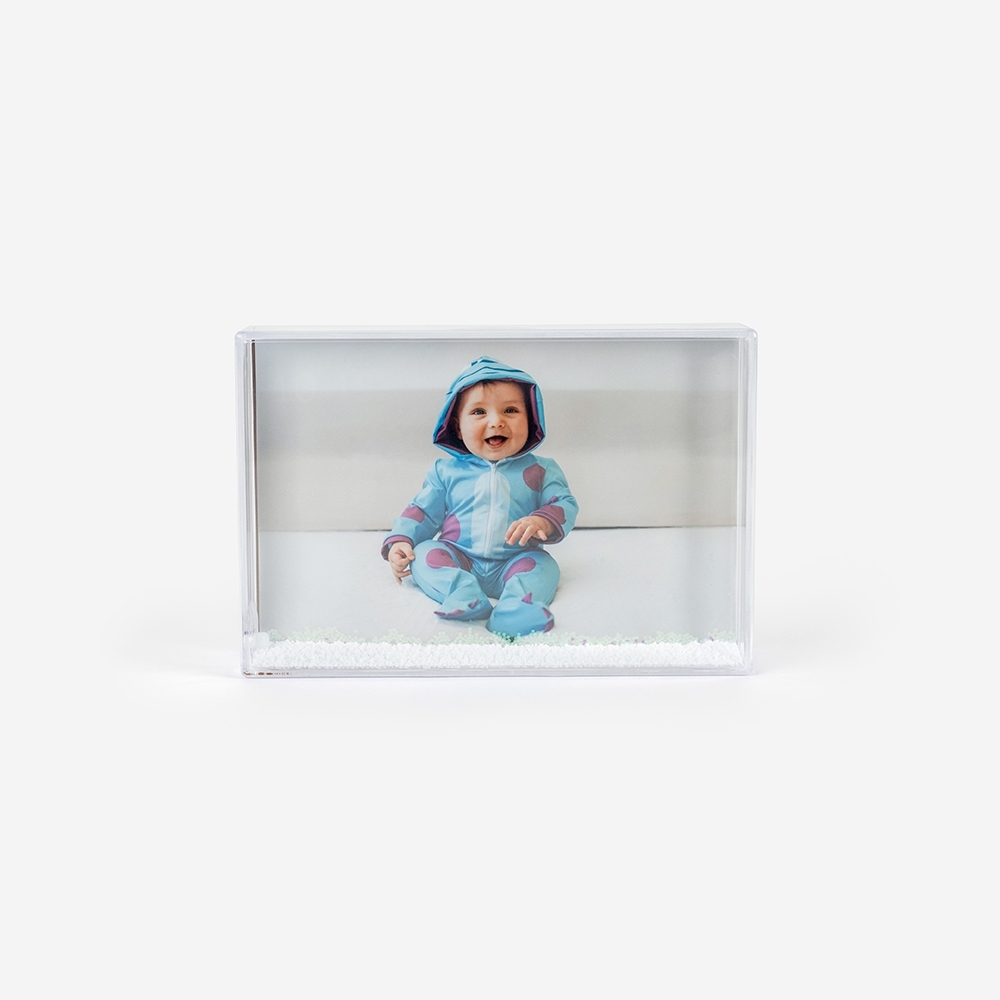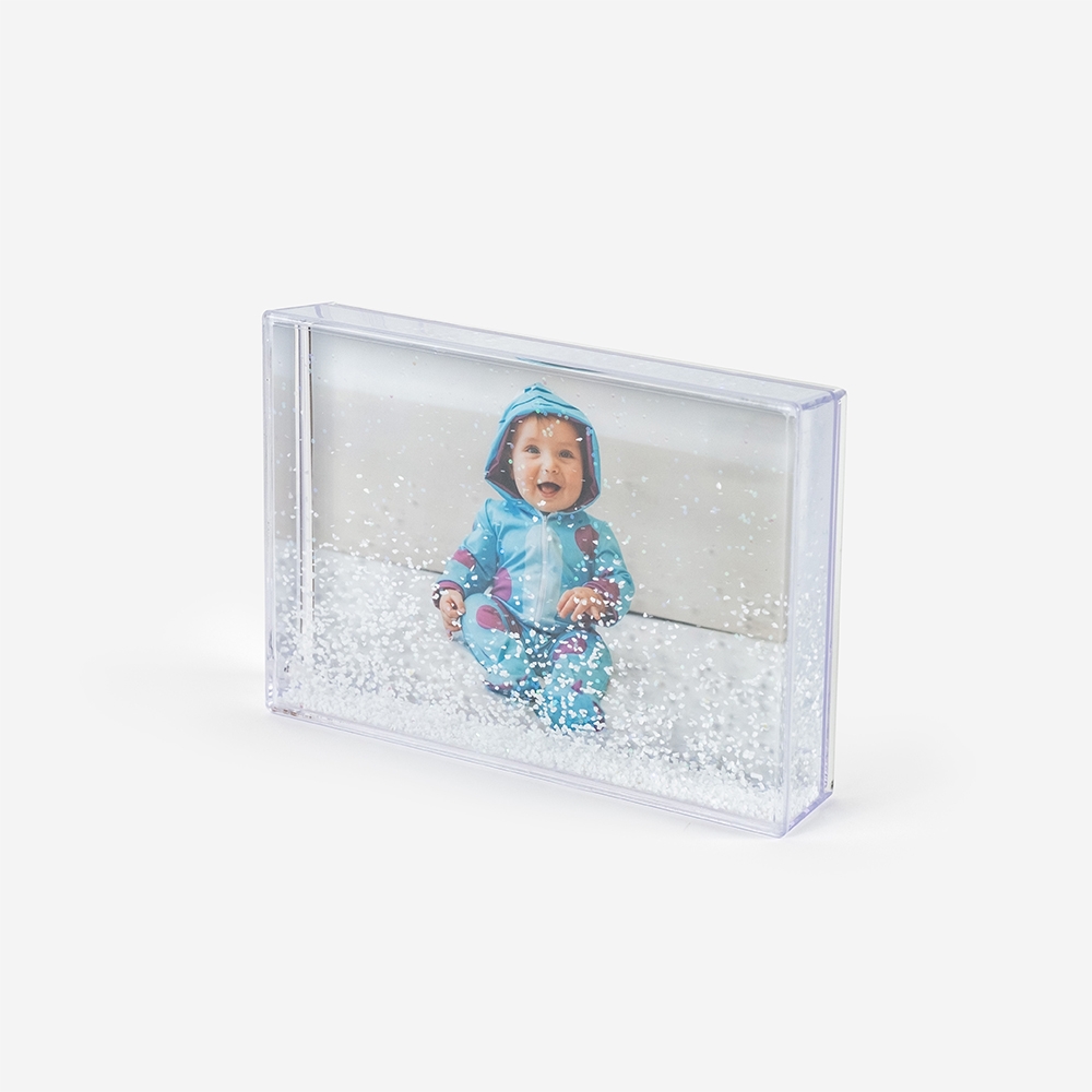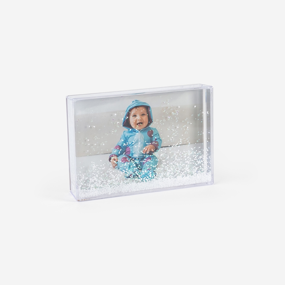 Moldura de alta qualidade, composta por uma estrutura em plástico duro transparente, que se faz acompanhar de um efeito de flocos de neve que surge quando a moldura é agitada.